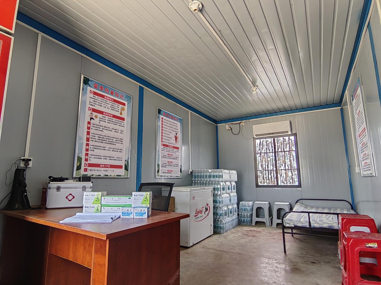面對夏季高溫挑戰,項目部堅持“以人為本、科技賦能、預防為主”的原則,制定“1+N”高溫專項施工方案,讓工人安心施工。在作業時間上,根據氣溫動態調整:37℃以下實行 “早出工、晚收工、中午休”的兩班倒模式;37℃以上則采取“白天培訓、夜間施工”的方式,避開10:00-16:00的高溫時段。同時,防暑保障實現全覆蓋,現場設立配備空調、飲水機和急救箱的醫務室,每日供應綠豆湯、冰鎮鹽汽水等飲品,并發放藿香正氣水、風油精及大冰塊等防暑物資,切實保障作業人員健康安全。