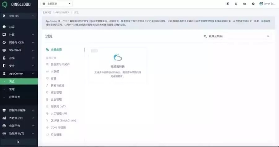 作為青云QingCloudAppCenter上的獨立應用,用戶可以搜索“視頻云轉碼”關鍵詞快速找到應用。