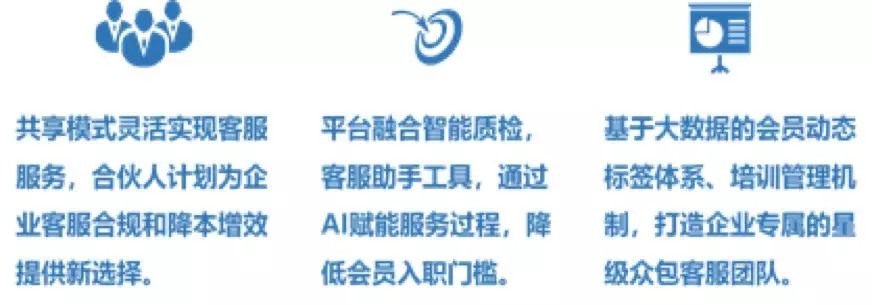 平臺具備眾包運營、云端平臺、質量管控、培訓認證、精準營銷、智能客服六大功能要素。通過AI賦能共享,實現市場人力資源與企業客服需求的高低峰匹配。